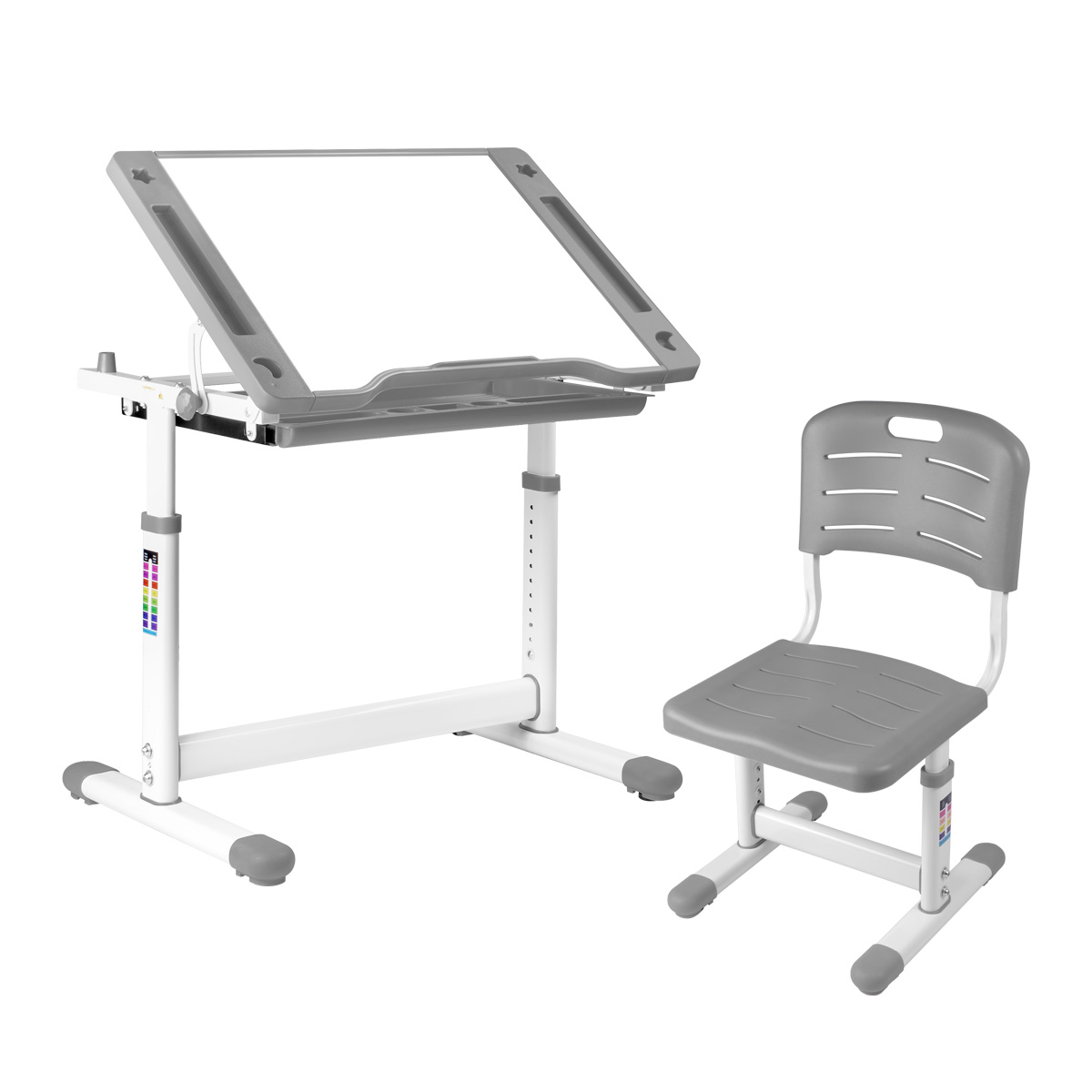 Kinderzen Arlekino – лучший выбор для тех, кто только идёт в детский сад или начальную школу. Комплект состоит из парты и стула. Парта и стул регулируются по высоте, поэтому они подойдут разным возрастным группам. Минимальный возраст ребёнка – 3 года, минимальный рост – 95 см.
